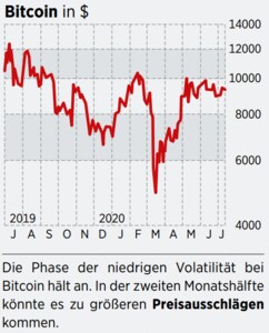 Kommt der für das zweite Halbjahr erwartete große Dreh des Bitcoin-Kurses nach oben ohne vorherige Korrektur? Das Chartbild sah zuletzt nach schwächeren Kursen aus, nachdem die Aufwärtstrendlinie seitlich verlassen wurde. Kurzfristige Einschätzungen des Kursverlaufs stehen beim Bitcoin aber traditionell auf wackeligen Füßen. Ein wichtiger Einflussfaktor bleibt kurzfristig die Entwicklung an den Aktienmärkten.