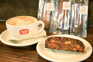 厚さ約1.5センチ。生地の密度が高く、ガリガリと歯応え抜群で満足感たっぷり。かむほどに香ばしさが口の中に広がり、その余韻に浸った。チョコのほのかな甘みが絶妙で、コーヒーとの相性もバッチリ。本場、イタリアではラテなど飲み物に浸して食べるとか。
