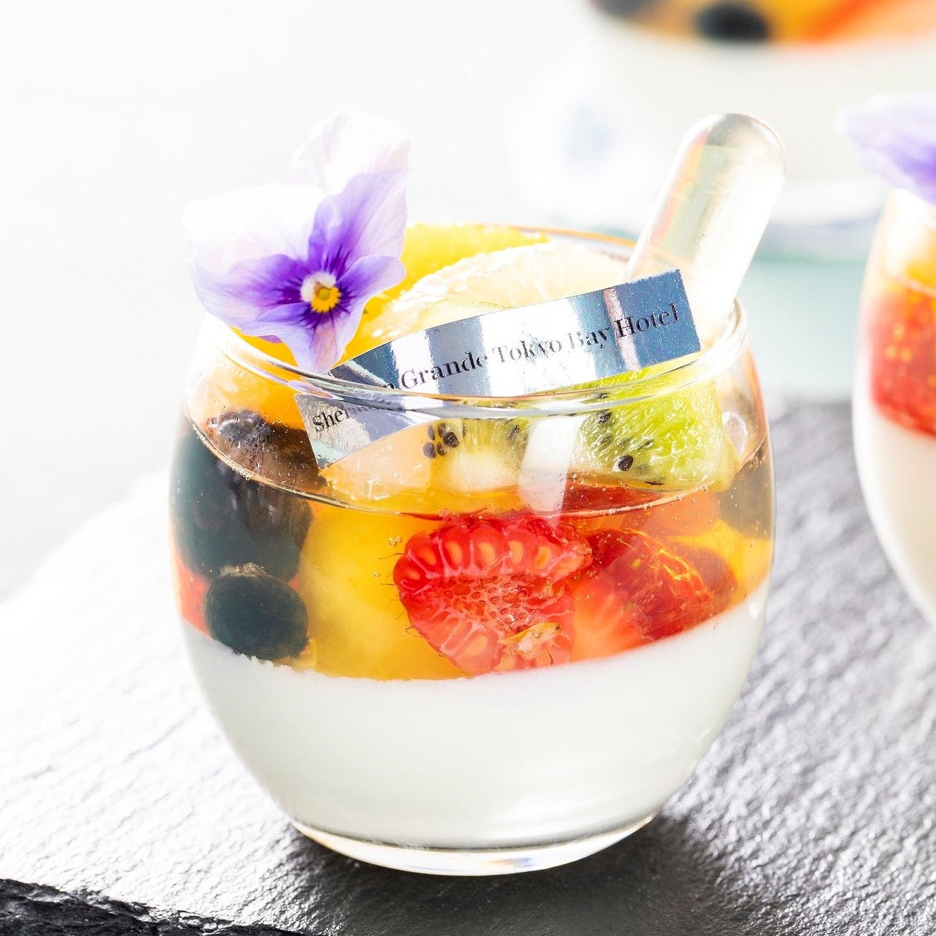 グラスに生姜風味のブランマンジェを入れ、いちご、ブルーベリー、ラズベリー、ブラックベリー、メロン、キウイ、オレンジ、グレープフルーツなどのフルーツを閉じ込めた生姜風味のゼリーを重ねました。生姜のすっきりとした味わいと、フルーツの酸味が合わさって、新緑の季節にぴったりの爽やかなスイーツに仕上げています。お好みでひやし飴のシロップをかけてお召し上がりください。