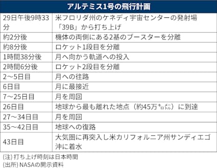 オリオン宇宙船は打ち上げ後、数日かけて月に向かう。6日目には月の地表から約97キロメートルの地点に最接近する。その後、月周回軌道の飛行を続け、35日目に地球への復路に入る。43日目に地球の大気圏に再突入し、米カリフォルニア州サンディエゴ沖の太平洋に着水して帰還する計画だ。