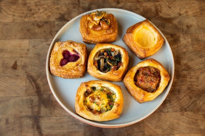 旨味と柔らかい酸味のあるルヴァン種と発酵の香りが豊かなポーリッシュ種の2種を使用したクロワッサン生地を使用しました。北海道産発酵バターの芳醇な香りとサクサク感が楽しめます。カスタードやラズベリーを使った定番のデニッシュから、ミートソースやスクランブルエッグなど、お食事として楽しめるものまで提供します。