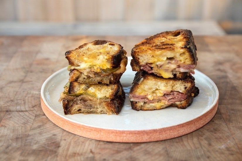 豪快にローストポークやコンビーフとチーズを挟んだホットサンドです。表面が焼かれることにより、酸味と香ばしさが楽しめます。一見硬そうにみえるカンパーニュですが、加水率が80%以上でもちもちしており、ソースやチーズが生地と一体となり、食べ応えのあるサンドイッチです。