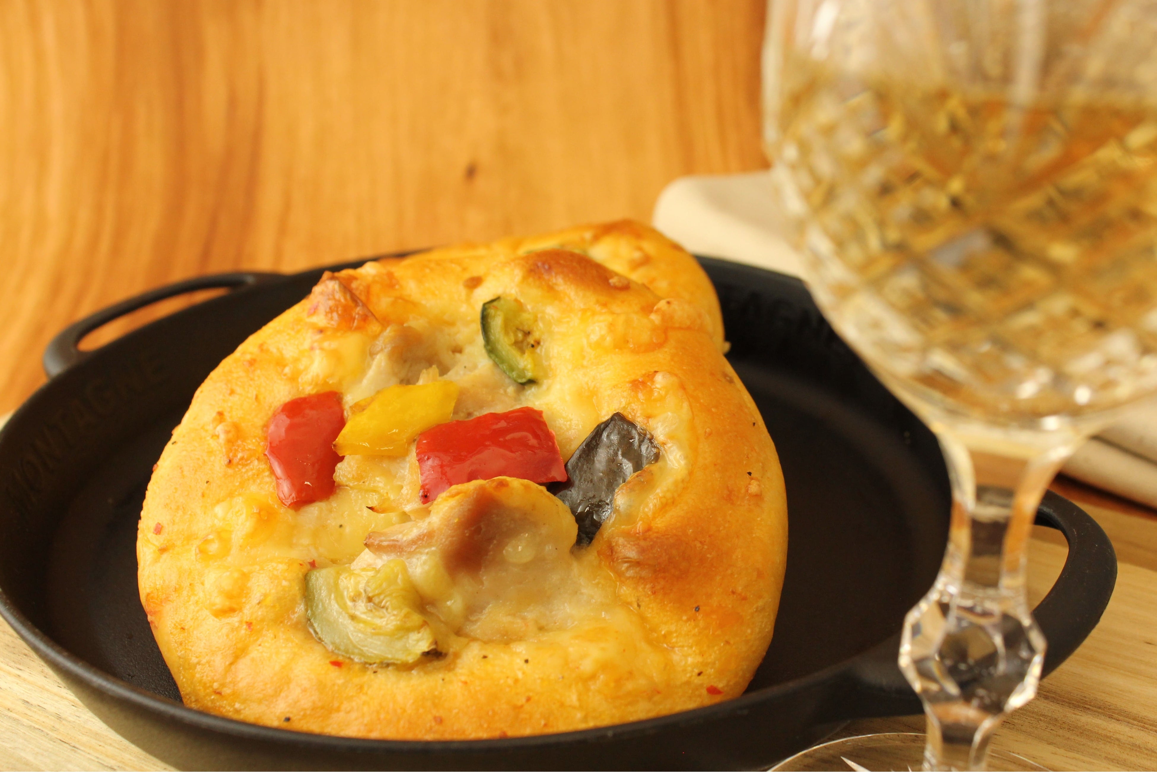 セミドライトマトを練り込んだ生地にアヒージョソースを塗り、スチームチキン、グリル野菜をのせて焼き上げました。食欲をそそるガーリックの風味と、生地から香るトマトの爽やかさが絶妙。すっきりとした白ワインを組み合わせると、濃厚な味わいもあっさりといただけます。