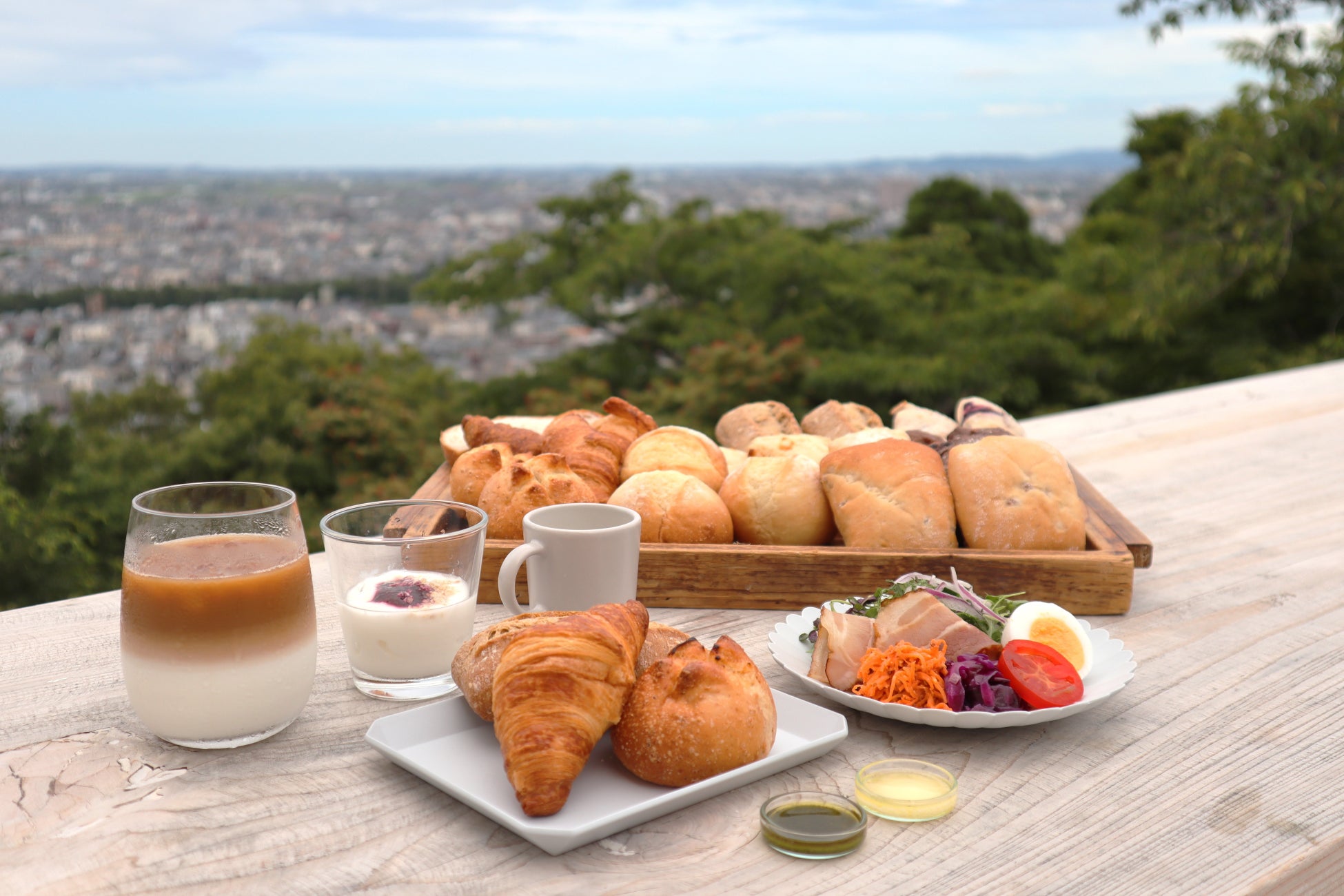 土日祝の朝限定でオープンする、店内の工房で焼き上げる自家製パンが自慢のお店です。野菜ポタージュ、フルーツグラノラヨーグルト、お好きなドリンクがセットになった、ちょっと贅沢で体に優しいモーニングセットをお楽しみいただけます。併設のスカイデッキからは市街地が一望できる絶景が広がっており、いつ来ても足羽山の四季折々の風景や空気感を体験できるので、週末のごほうびとして、旅先の思い出として、特別な朝をお楽しみください。
