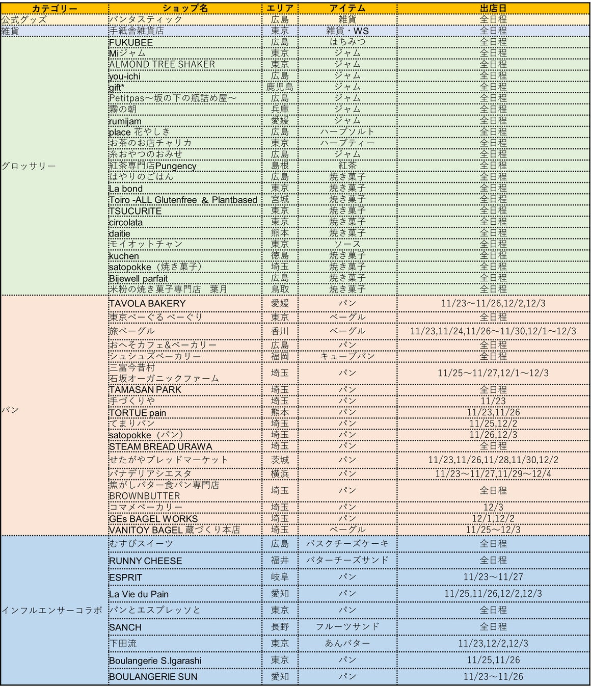 ※参加ショップ及び参加日程、パンの到着時間は予告なく変更になる場合がございますので予めご了承ください。