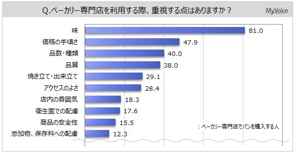 ■ベーカリー専門店利用時の重視点は「味」が購入者の8割強、「価格の手頃さ」が5割弱、「品数・種類」「品質」が4割前後、「焼き立て・出来立て」「アクセスのよさ」が各3割弱