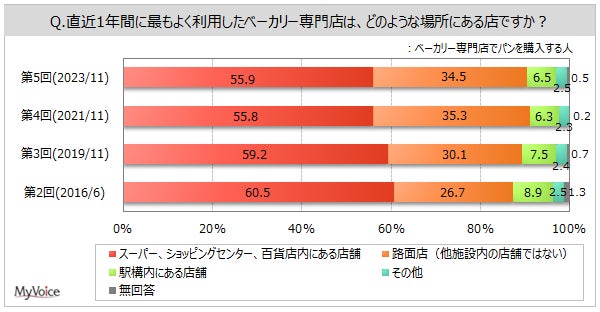 直近1年間に最もよく利用したベーカリー専門店の場所は、「スーパー、ショッピングセンター、百貨店内にある店舗」が購入者の55.9%、「路面店」が34.5%です。