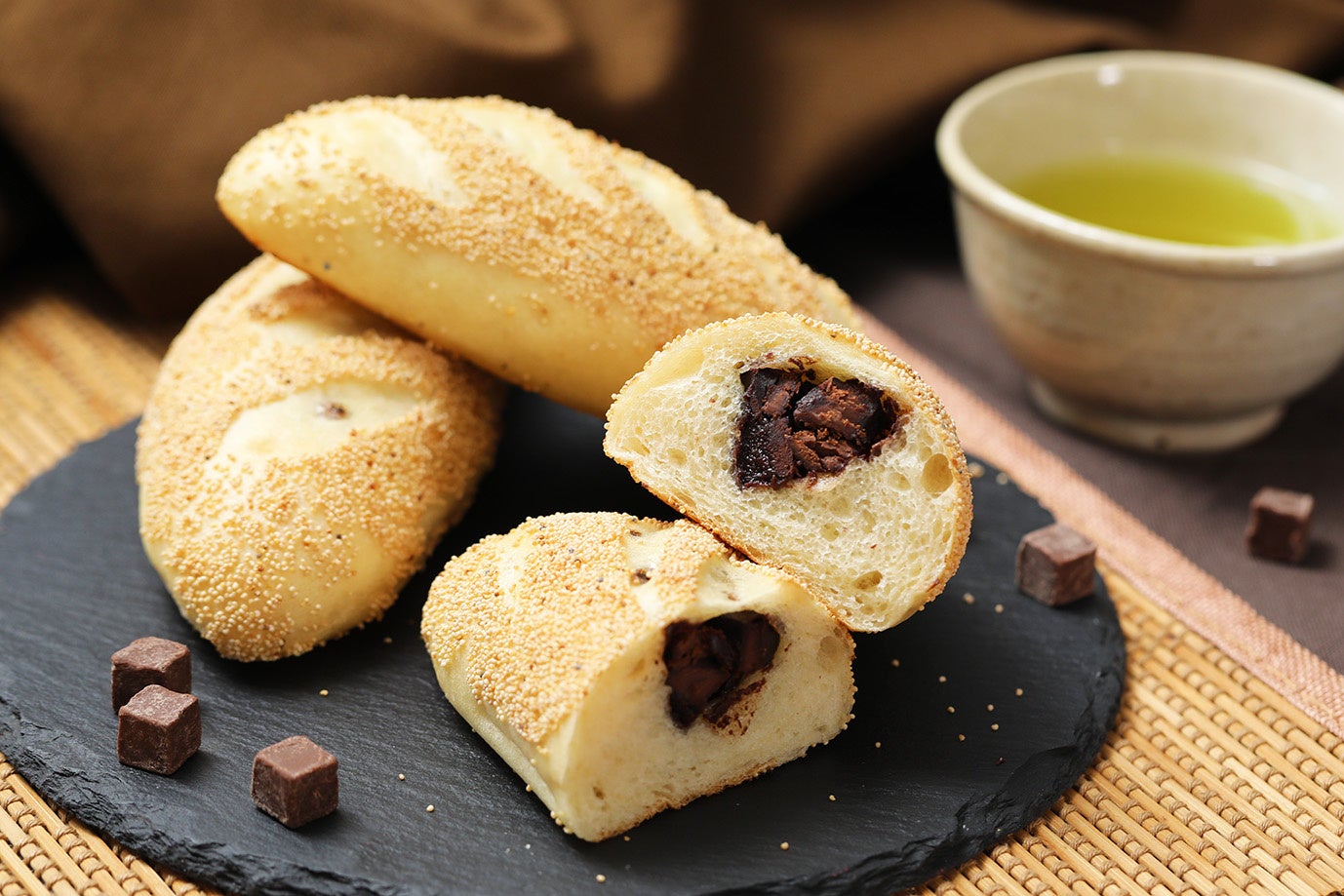 こだわり:フランスパン生地でザクザクとした食感のチョコを包み、仕上げにけしの実をつけて焼き上げました。まろやかなチョコの味わいとともに楽しめるソフトな生地とけしの