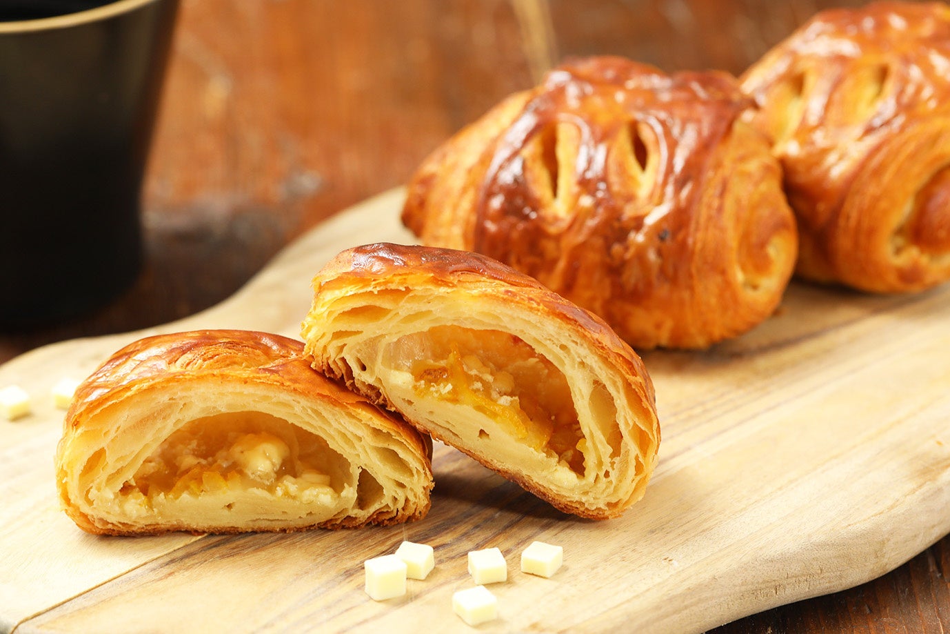 こだわり:定番商品『パンオショコラ』の冬季限定フレーバー。発酵バターが香るクロワッサン生地に『木頭ゆず』とホワイトチョコを散りばめて焼き上げました。『木頭ゆず』の爽やかな香りと酸味、ホワイトチョコの甘味のバランスが後を引くおいしさをお楽しみいただけます。