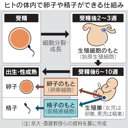 ヒトの体内では卵子や精子のもとになる細胞は胎児の段階でできる。受精後約2〜3週間で生殖細胞のもとになる「始原生殖細胞」ができる。さらに、始原生殖細胞は同約10週間までに女児では卵子のもと「卵原細胞」、男児では精子のもと「前精原細胞」になる。出生後、性成熟すると卵子や精子が体内でつくられるようになる。